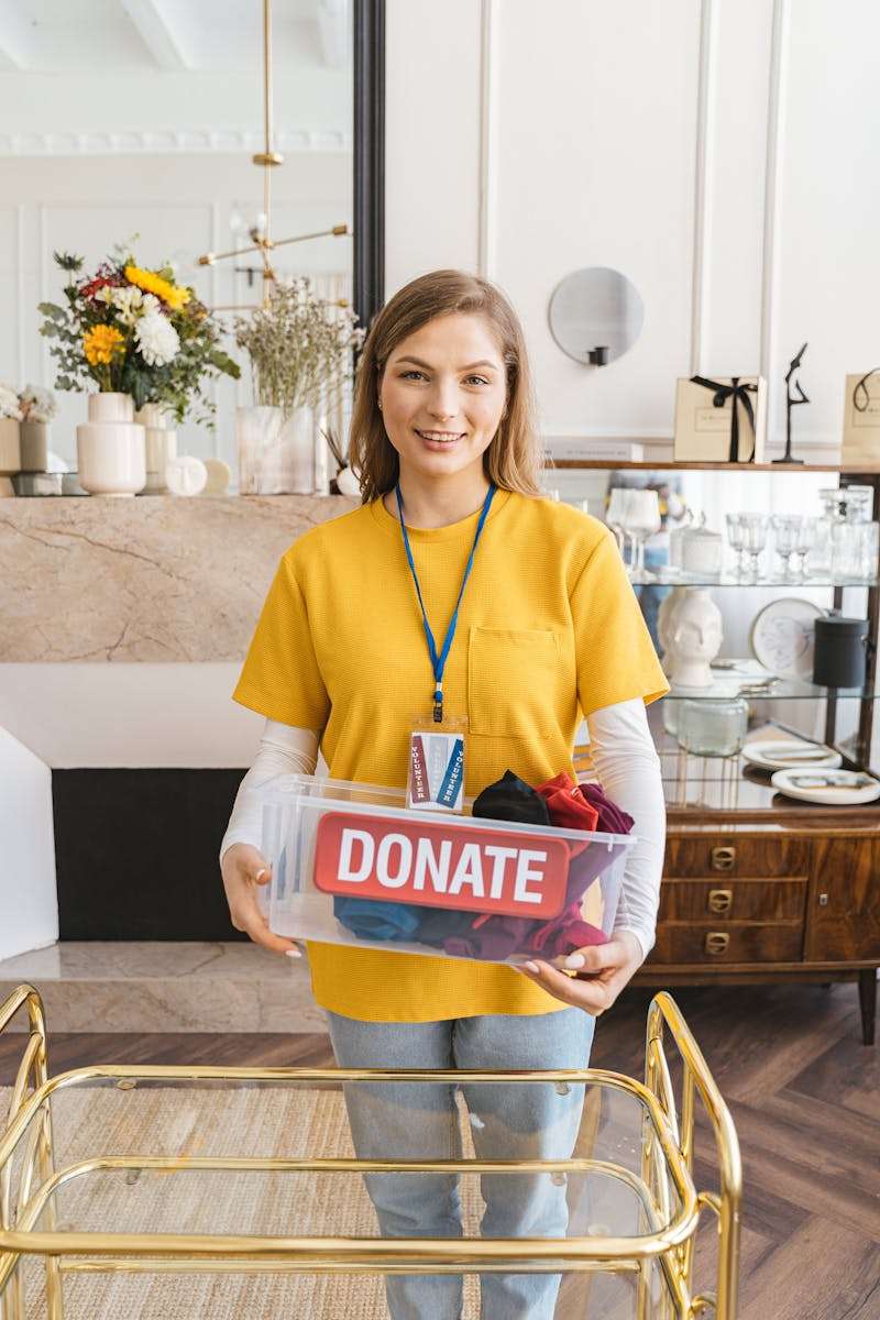 Decluttering Portrait of Smiling Woman with Donation Box